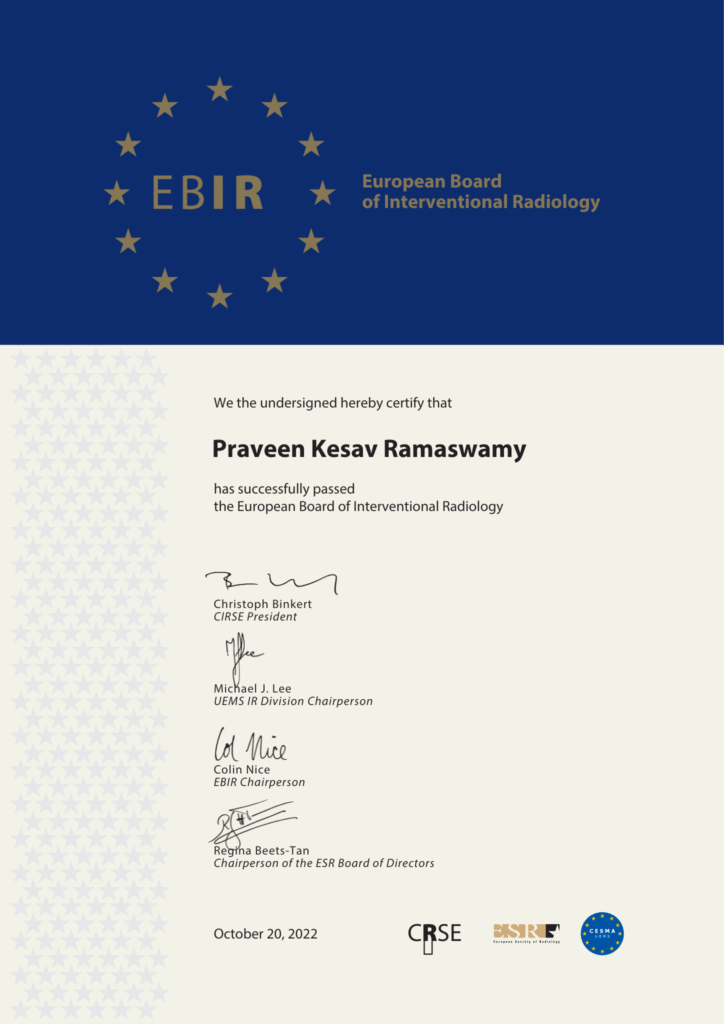 Dr. Praveen Kesav Ramaswamy is a specialist in Interventional Radiology, trained at AIIMS New Delhi and certified by the European Board of Interventional Radiology (EBIR), European Diploma in Radiology (EDIR), and DICR. His work focuses on treating complex medical conditions using minimally invasive, image-guided techniques that avoid major surgery.