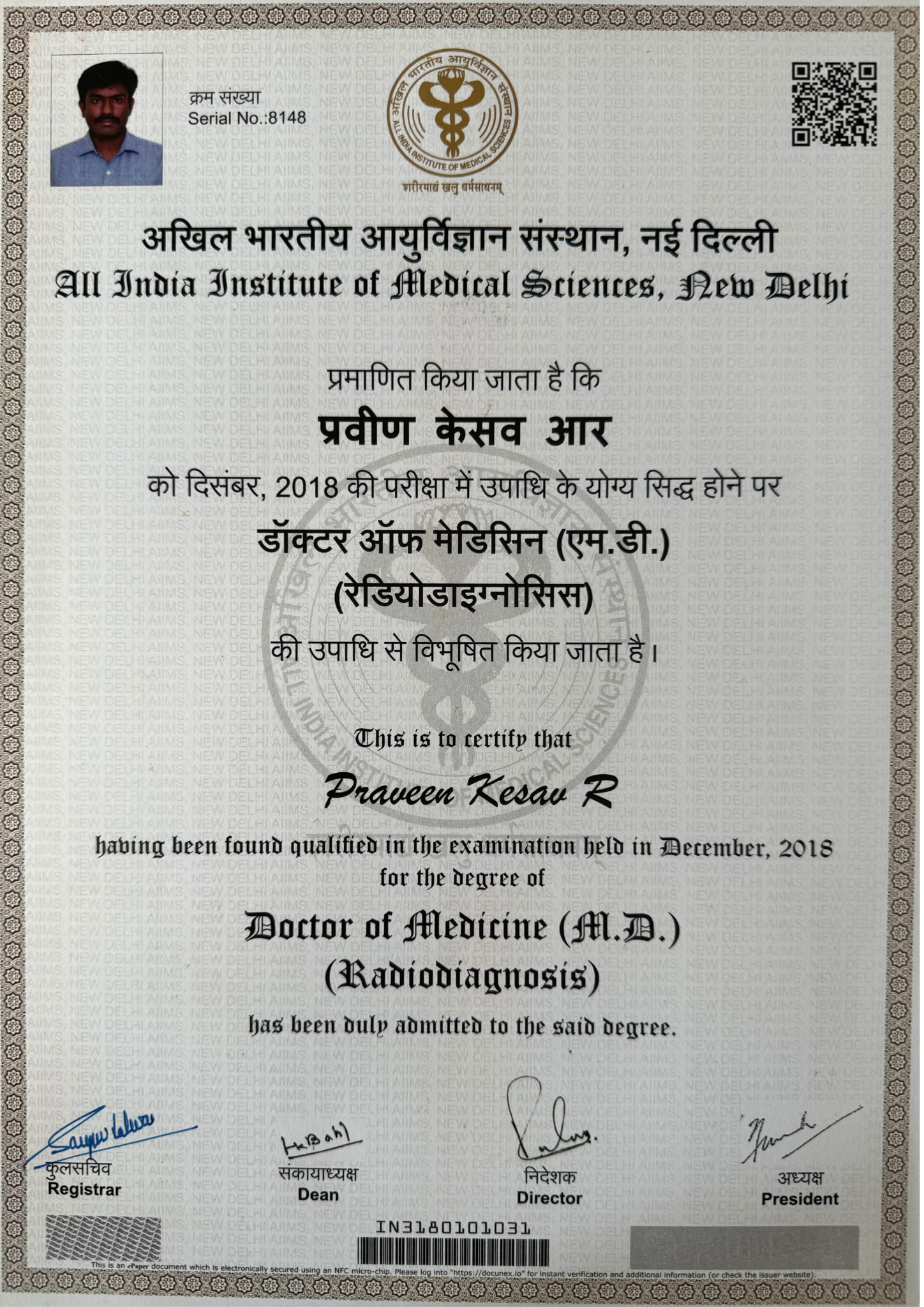 Dr. Praveen began his medical journey at Madras Medical College and completed his MD in Radiodiagnosis at AIIMS, New Delhi. Over the years, he has trained at renowned institutions including the AIIMS Trauma Centre, IRCH, and the NCI Jhajjar campus.